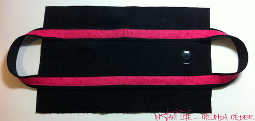 8. Rávarrtam a pántot az anyagra, a pánt mindkét szélén végigvarrva. Arra kell figyelni, hogy ne varrjuk végig az anyagon, hanem kb 5 cm-rel a széle előtt fejezzük mindenhol be! Felvarrtam a gombot.