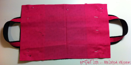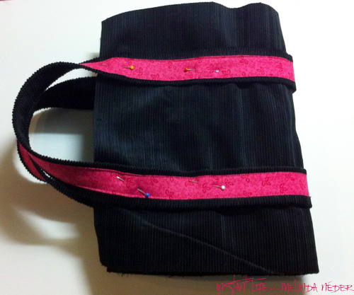 6. Az összevarrt pántot rátűztem a külső borító színére, a szélétől 5-5 cm-rel beljebb.